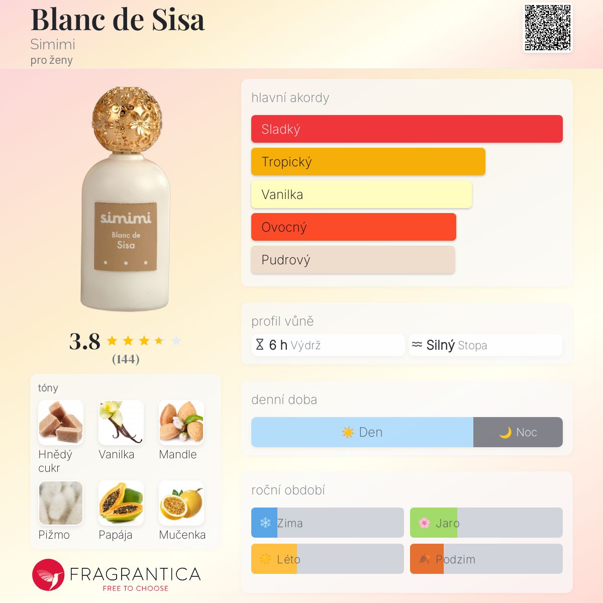 Blanc de Sisa podle Simimi je Floral vůně pro ženy. Blanc de Sisa byl/a uveden/a v roce 2016. "Nosem" za touto vůní je Paolo Terenzi. Vrchní tóny jsou Hnědý cukr, Papája a Mango; střední tóny jsouVanilka, Mandle, Mučenka a Magnólie ; základní tóny jsou Vanilka, Pižmo, Santalové dřevo a Jantar (ambra).
