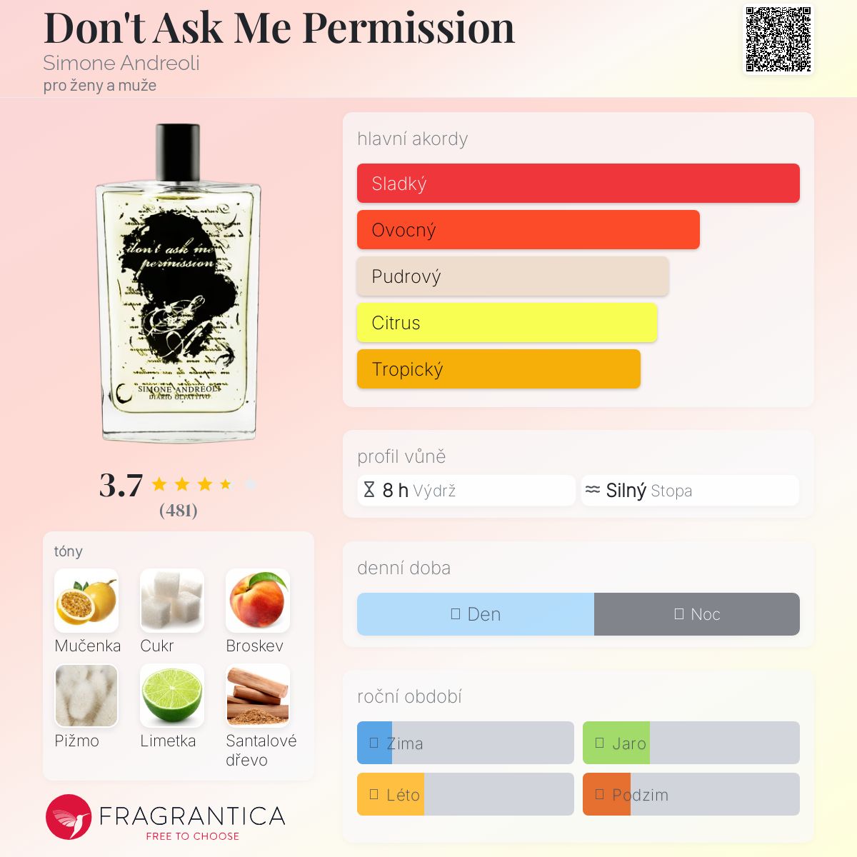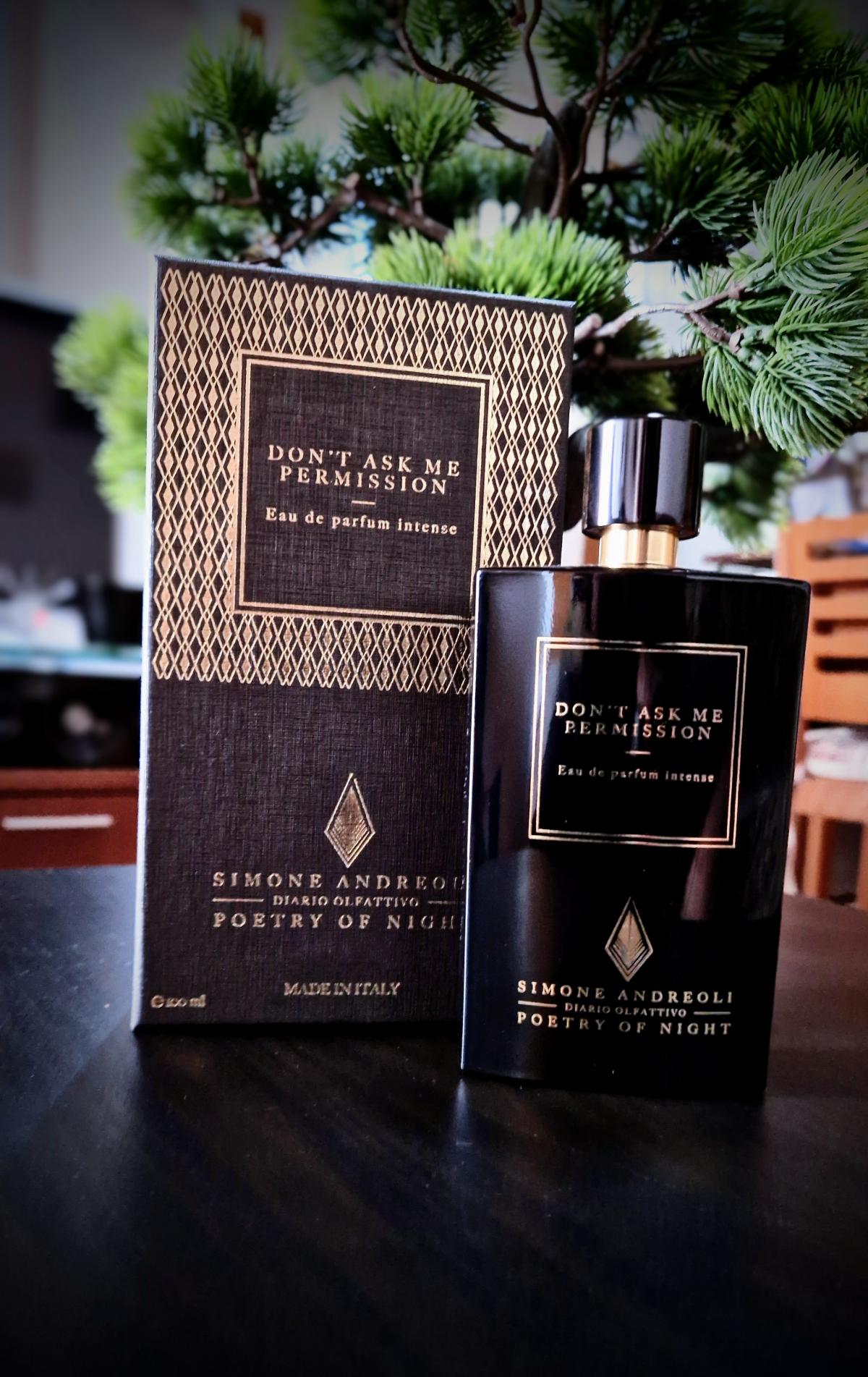 Don't Ask Me Permission podle Simone Andreoli je Orientální vůně pro ženy a muže. Don't Ask Me Permission byl/a uveden/a v roce 2017. "Nosem" za touto vůní je Simone Andreoli. Vrchní tóny jsou Cukr, Limetka a Sladký pomeranč; střední tóny jsouMučenka, Broskev, Ylang-Ylang a Otočník ; základní tóny jsou Bílé pižmo, Santalové dřevo, Ambra a Cachaça.