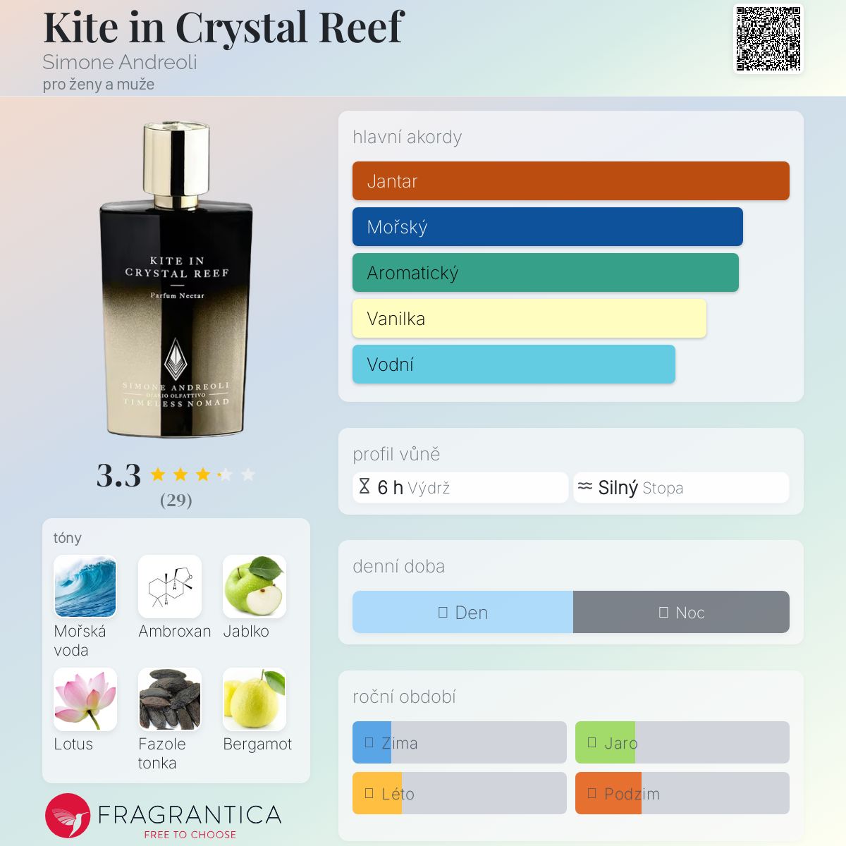 Kite in Crystal Reef podle Simone Andreoli je Woody Aquatic vůně pro ženy a muže. Toto je nová vůně. Kite in Crystal Reef byl/a uveden/a v roce 2025. "Nosem" za touto vůní je Simone Andreoli. Vrchní tóny jsou Zelené jablko, Bergamot a Neroli; střední tóny jsouVodní tóny a Bílý lotos ; základní tóny jsou Ambroxan, Fazole tonka, Vanilka a Cedr.
