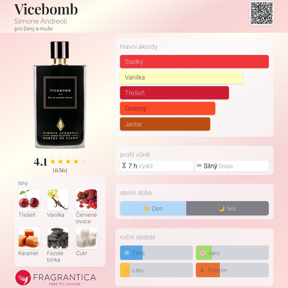 Vicebomb podle Simone Andreoli je vůně pro ženy a muže. Vicebomb byl/a uveden/a v roce 2023. Vrchní tóny jsou Třešeň, Červené ovoce a Karamel; střední tóny jsouVanilka, Cukr a Ylang-Ylang ; základní tóny jsou Fazole tonka, Jantar (ambra) a Vzácné dřevo.