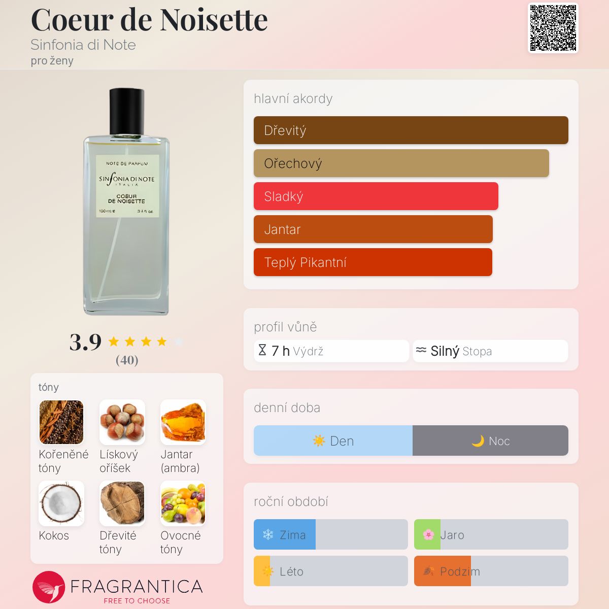 Coeur de Noisette podle Sinfonia di Note je Floral Fruity Gourmand vůně pro ženy. Coeur de Noisette byla spuštěna během 2000. Vrchní tóny jsou Kokos a Ovocné tóny; střední tóny jsouLískový oříšek a Květinové tóny ; základní tóny jsou Koření, Jantar (ambra) a Dřevité tóny.