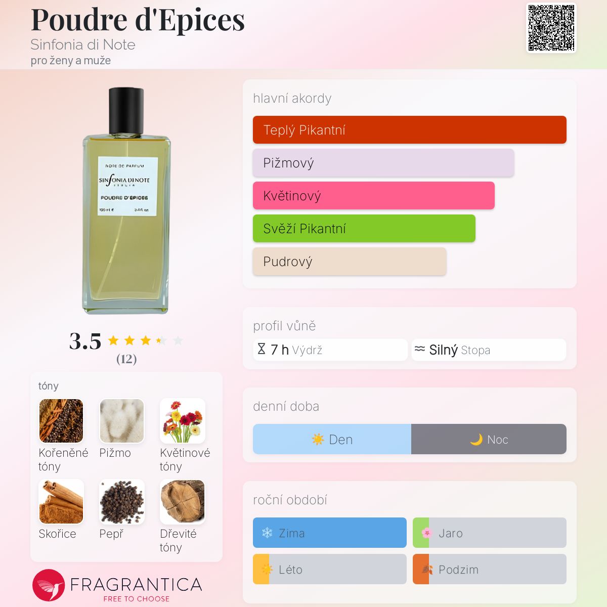 Poudre d'Epices podle Sinfonia di Note je Aromatic Spicy vůně pro ženy a muže. Poudre d'Epices byla spuštěna během 2000. Vrchní tóny jsou Pelargónie a Zelené tóny; střední tóny jsouKoření, Květinové tóny a Skořice ; základní tóny jsou Pižmo, Pepř a Dřevité tóny.