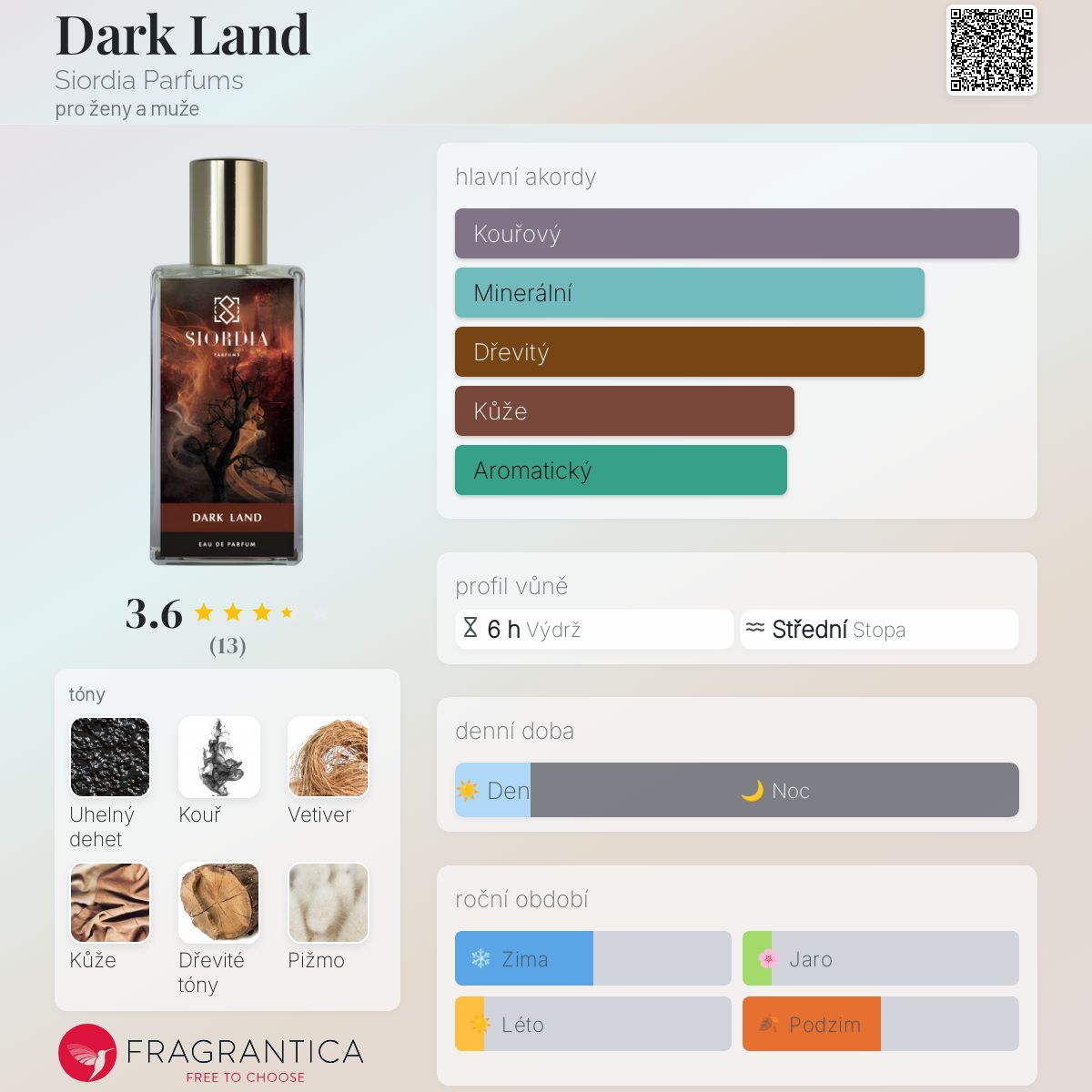 Dark Land podle Siordia Parfums je Leather vůně pro ženy a muže. Dark Land byl/a uveden/a v roce 2021. "Nosem" za touto vůní je Ekaterina Siordia.