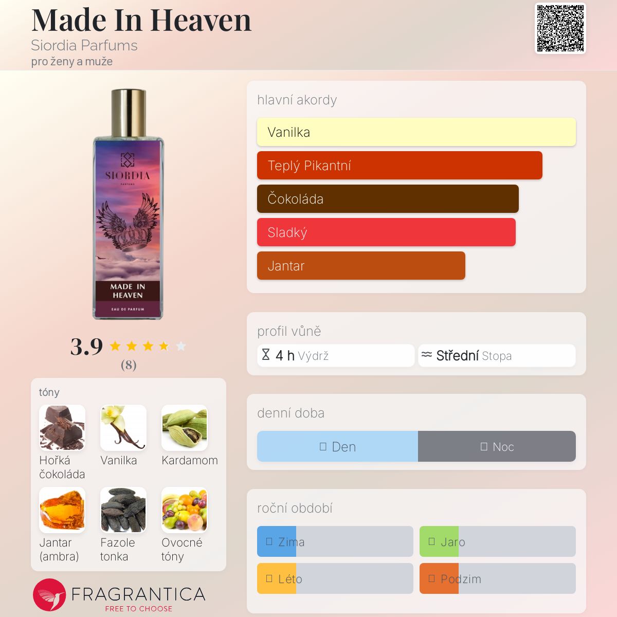 Made In Heaven podle Siordia Parfums je vůně pro ženy a muže. Made In Heaven byl/a uveden/a v roce 2021. "Nosem" za touto vůní je Ekaterina Siordia.