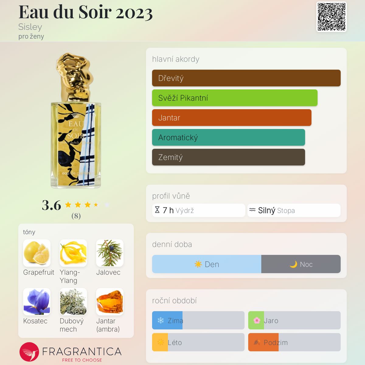Eau du Soir 2023 podle Sisley je vůně pro ženy. Eau du Soir 2023 byl/a uveden/a v roce 2023. Eau du Soir 2023 byl/a vytvořen/a Hubert d'Ornano, Isabelle d'Ornano a Jeannine Mongin. Vrchní tóny jsou Grapefruit a Pepř; střední tóny jsouYlang-Ylang, Jalovec, Kosatec, Jasmín, Hřebíček, Růže, Šeřík a Konvalinka ; základní tóny jsou Dubový mech, Jantar (ambra), Pačuli, Pižmo a Labdanum.