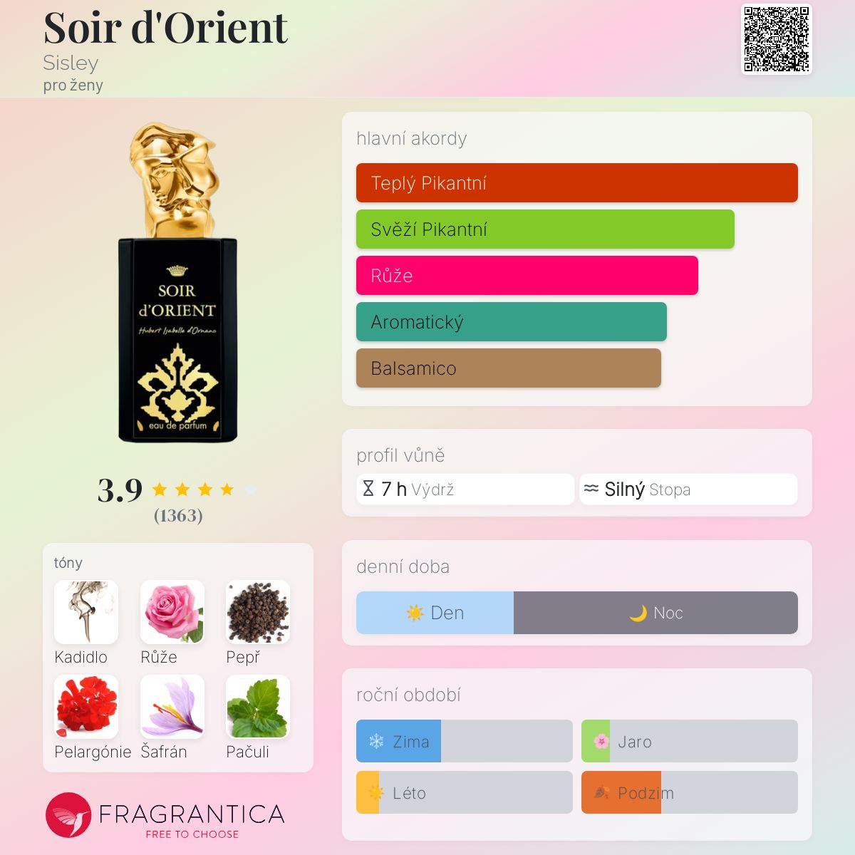 Soir d'Оrient podle Sisley je Orientální vůně pro ženy. Soir d'Оrient byl/a uveden/a v roce 2015. "Nosem" za touto vůní je Olivier Pescheux. Vrchní tóny jsou Šafrán, Íránské galbanum a Italský citrón; střední tóny jsouTurecká růže, Černý pepř a Pelargónie ; základní tóny jsou Kadidlo, Pačuli a Santalové dřevo.