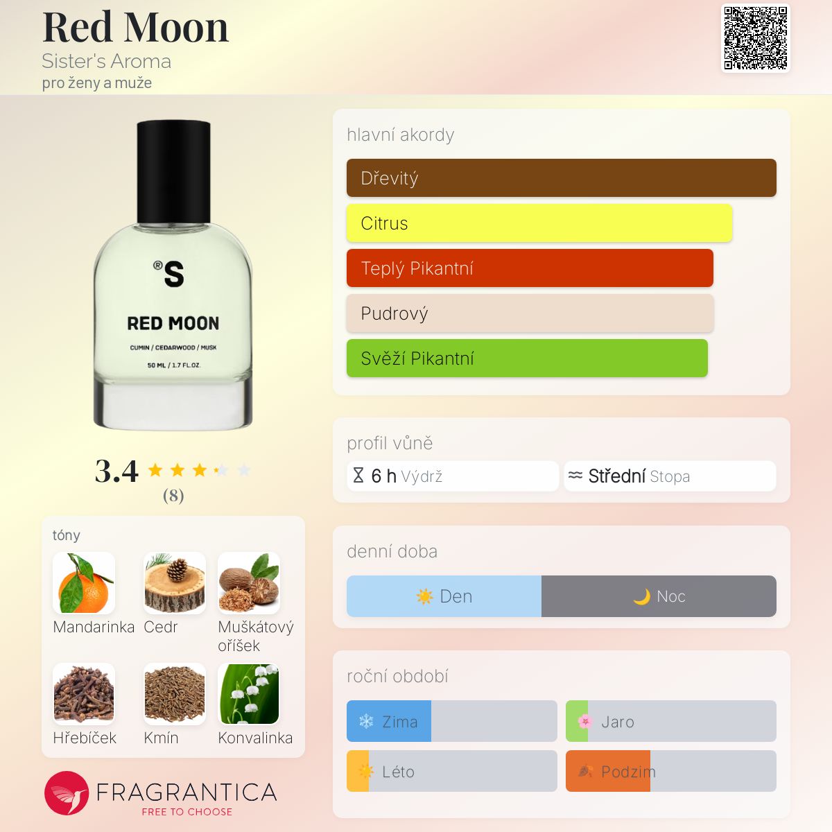 Red Moon podle Sister's Aroma je Woody Floral Musk vůně pro ženy a muže. Red Moon byl/a uveden/a v roce 2023. Vrchní tóny jsou Mandarinka, Muškátový oříšek, Hřebíček a Kmín; střední tóny jsouCedr, Konvalinka, Šafrán a Fialka ; základní tóny jsou Jantar (ambra), Pižmo a Mech.