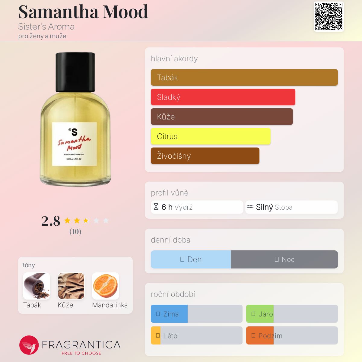 Samantha Mood podle Sister's Aroma je Leather vůně pro ženy a muže. Samantha Mood byl/a uveden/a v roce 2021. Vrchní tón je Tabák ; střední tón jeMandarinka ; základní tón je Kůže.