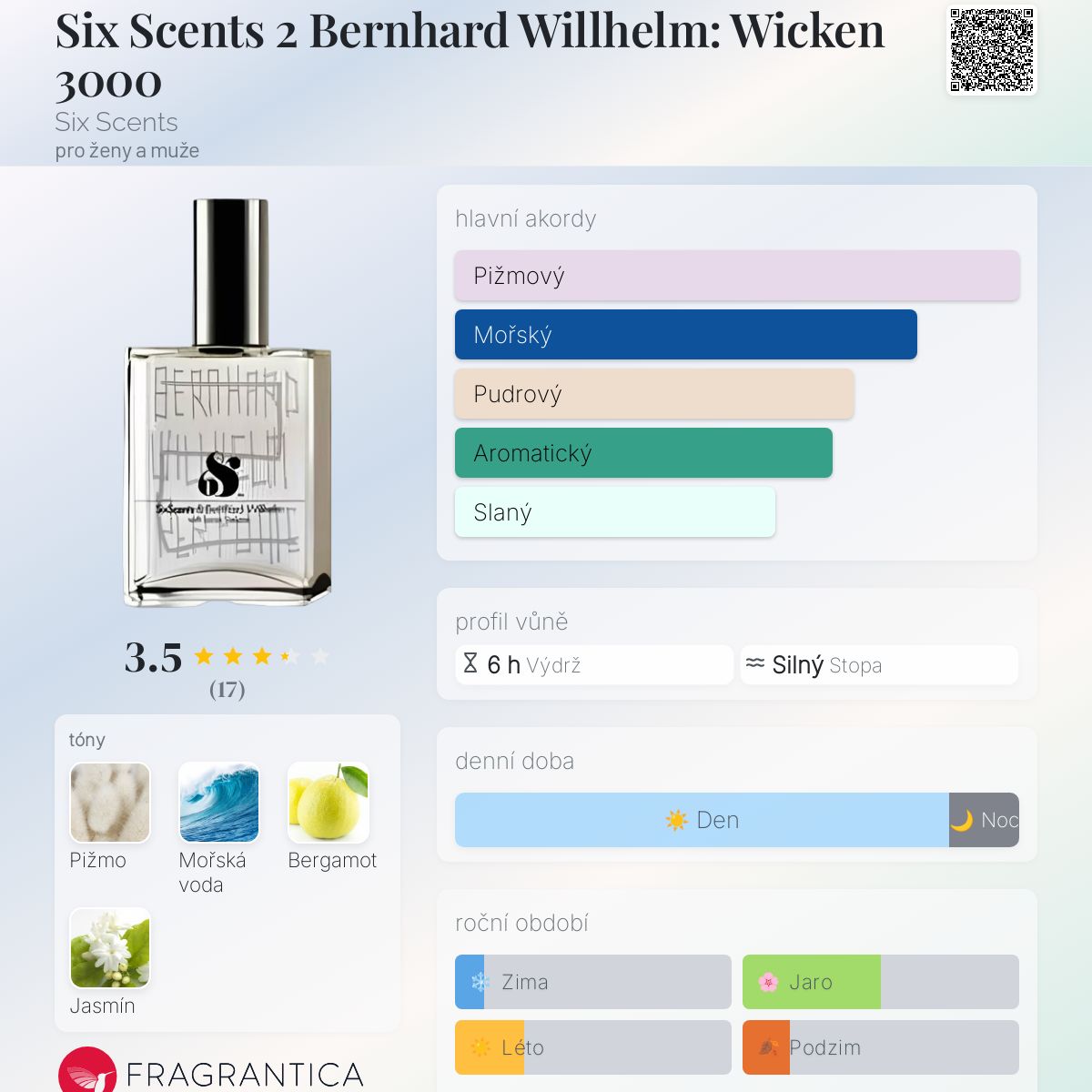 Six Scents 2 Bernhard Willhelm: Wicken 3000 podle Six Scents je vůně pro ženy a muže. Six Scents 2 Bernhard Willhelm: Wicken 3000 byl/a uveden/a v roce 2008. "Nosem" za touto vůní je Symrise.