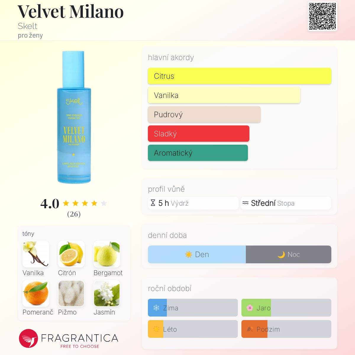 Velvet Milano podle Skelt je Floral Fruity Gourmand vůně pro ženy. Toto je nová vůně. Velvet Milano byl/a uveden/a v roce 2024. Vrchní tóny jsou Citrón, Bergamot, Pomeranč a Jablko; střední tóny jsouJasmín, Červené ovoce a Bílá růže ; základní tóny jsou Vanilka, Pižmo a Santalové dřevo.