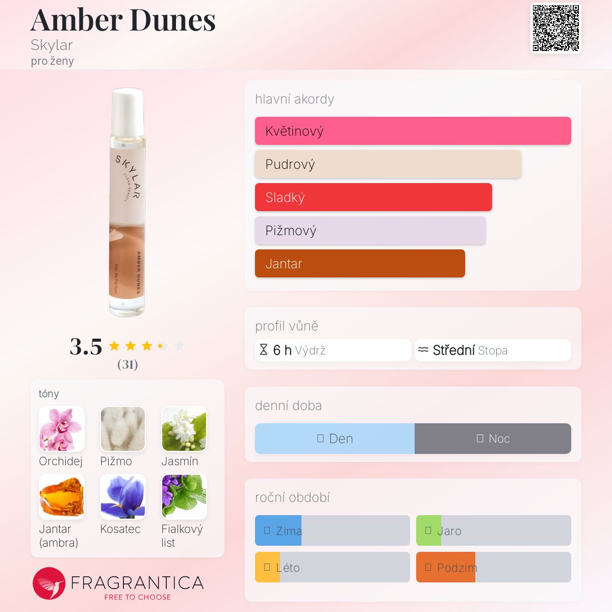 Amber Dunes podle Skylar je Orientální vůně pro ženy. Amber Dunes byl/a uveden/a v roce 2023. Vrchní tóny jsou Fialkový list, Bergamot a Hřebíček; střední tóny jsouVanilková orchidej, Jasmín a Okvětní lístky kosatce ; základní tóny jsou Pižmo, Jantar (ambra) a Santalové dřevo.