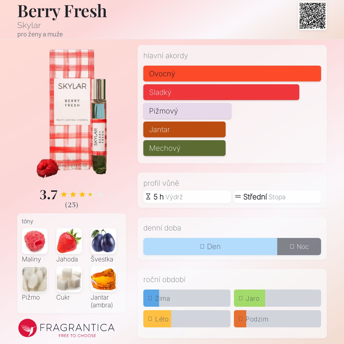 Berry Fresh podle Skylar je vůně pro ženy a muže. Berry Fresh byl/a uveden/a v roce 2021. Vrchní tóny jsou Maliny, Jahoda a Švestka; střední tóny jsouJasmín, Růžová pivoňka a Fialkové listy ; základní tóny jsou Pižmo, Cukrová třtina, Jantar (ambra) a Dubový mech.