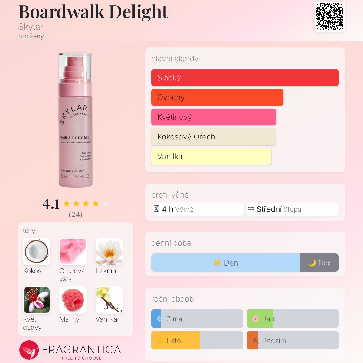 Boardwalk Delight podle Skylar je Floral Fruity Gourmand vůně pro ženy. Toto je nová vůně. Boardwalk Delight byl/a uveden/a v roce 2024. Vrchní tóny jsou Maliny, Sorbet, Vodní tóny a Jablko; střední tóny jsouKokosové mléko, Leknín a Květ guavy ; základní tóny jsou Cukrová vata, Vanilka, Jantar (ambra) a Pižmo.