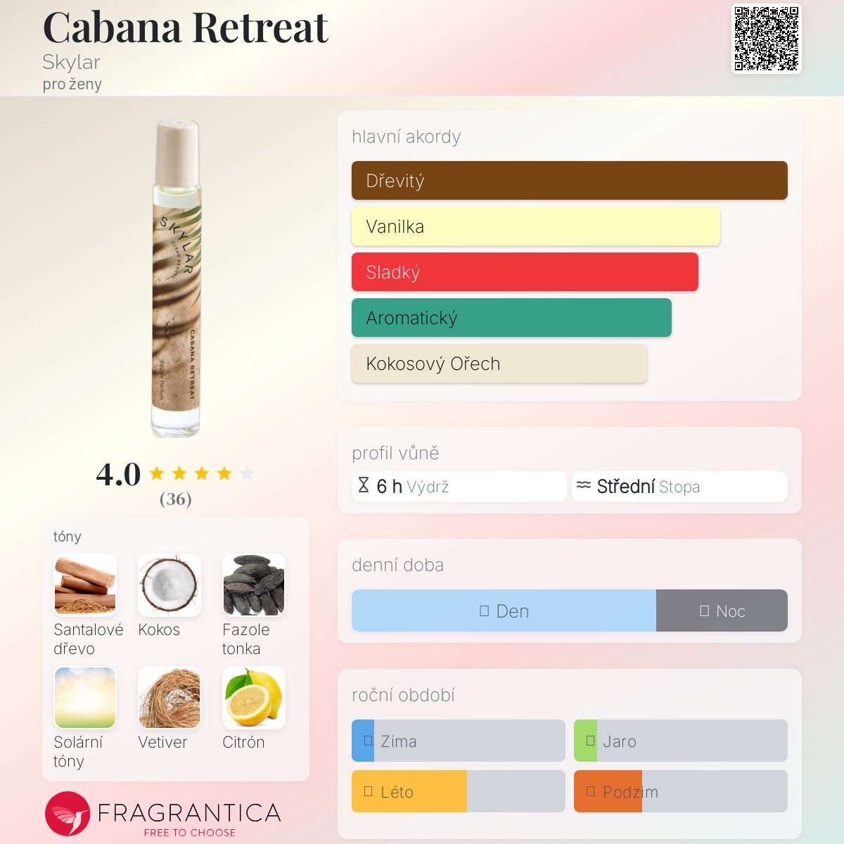 Cabana Retreat podle Skylar je Orientální Vanilla vůně pro ženy. Cabana Retreat byl/a uveden/a v roce 2022. Vrchní tóny jsou Citrón, Ananas, Mandarinka a Šalvěj; střední tóny jsouKokos, Solární tóny, Jasmín a Tuberóza ; základní tóny jsou Santalové dřevo, Fazole tonka, Vetiver a Vanilka.