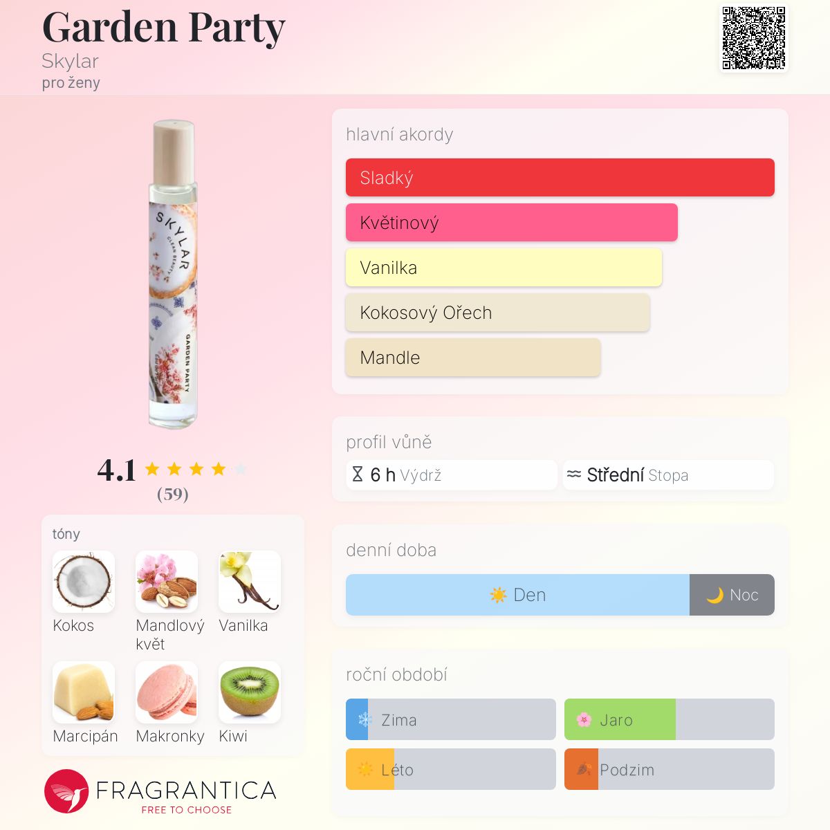 Garden Party podle Skylar je vůně pro ženy. Garden Party byl/a uveden/a v roce 2022. Vrchní tóny jsou Marcipán, Kiwi a Magnólie; střední tóny jsouKokos, Mandlový květ , Makronky a Gardénie ; základní tóny jsou Vanilka, Pižmo a Santalové dřevo.