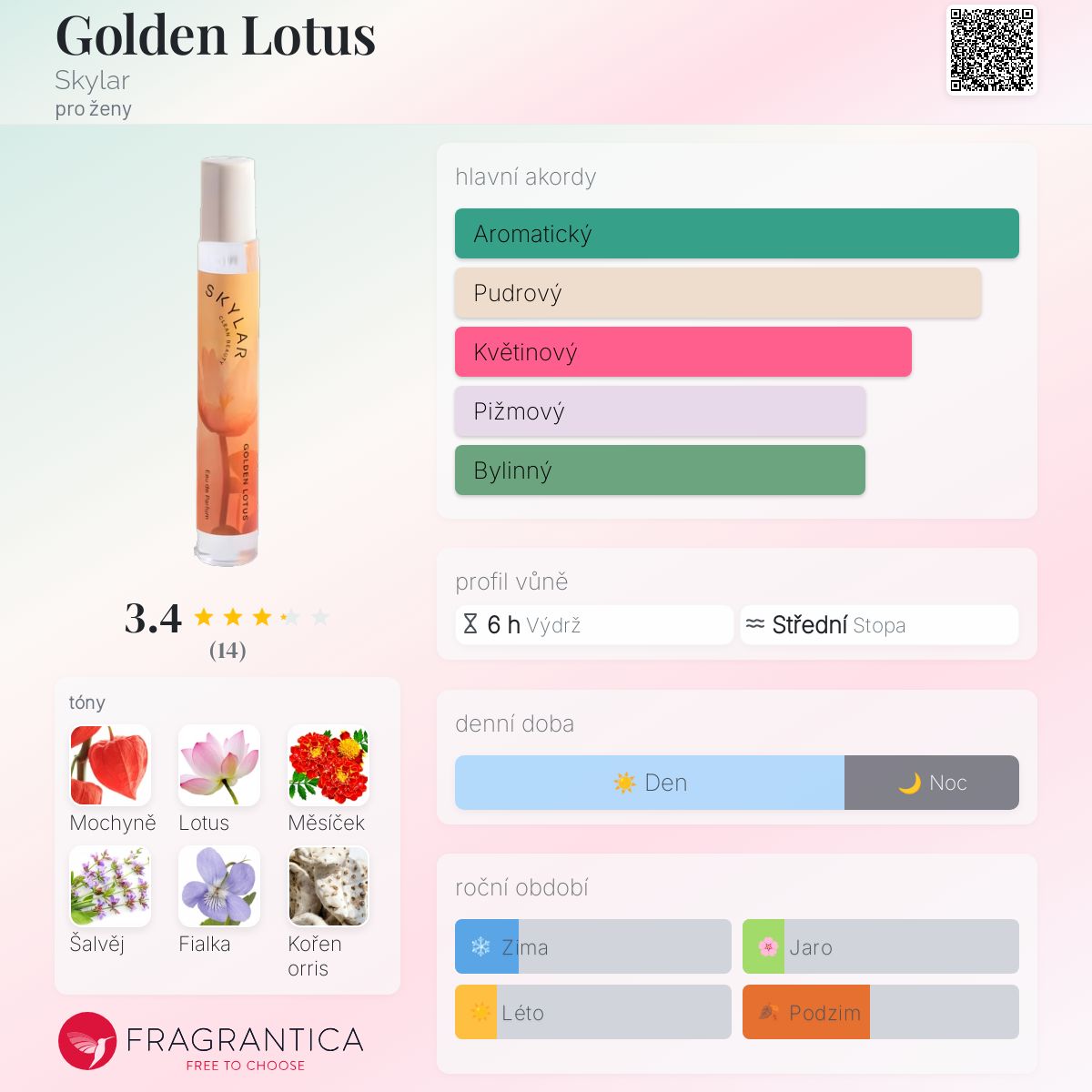 Golden Lotus podle Skylar je Floral vůně pro ženy. Golden Lotus byl/a uveden/a v roce 2021. "Nosem" za touto vůní je Sarah Horowitz. Vrchní tóny jsou Mochyně, Lotus a Aksamitník; střední tóny jsouŠalvěj, Fialka a Orris ; základní tóny jsou Pižmo, Jantar (ambra) a Vetiver.