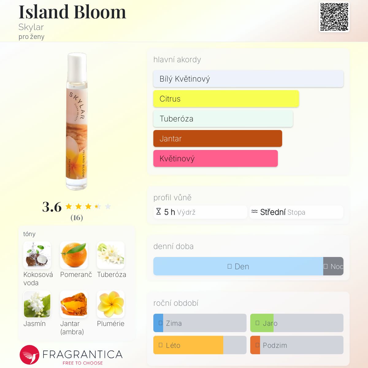 Island Bloom podle Skylar je Orientální Floral vůně pro ženy. Island Bloom byl/a uveden/a v roce 2023. Vrchní tóny jsou Kokosová voda, Pomeranč a Kardamom; střední tóny jsouTuberóza, Jasmín a Plumérie ; základní tóny jsou Jantar (ambra), Vanilková orchidej a Cedr.
