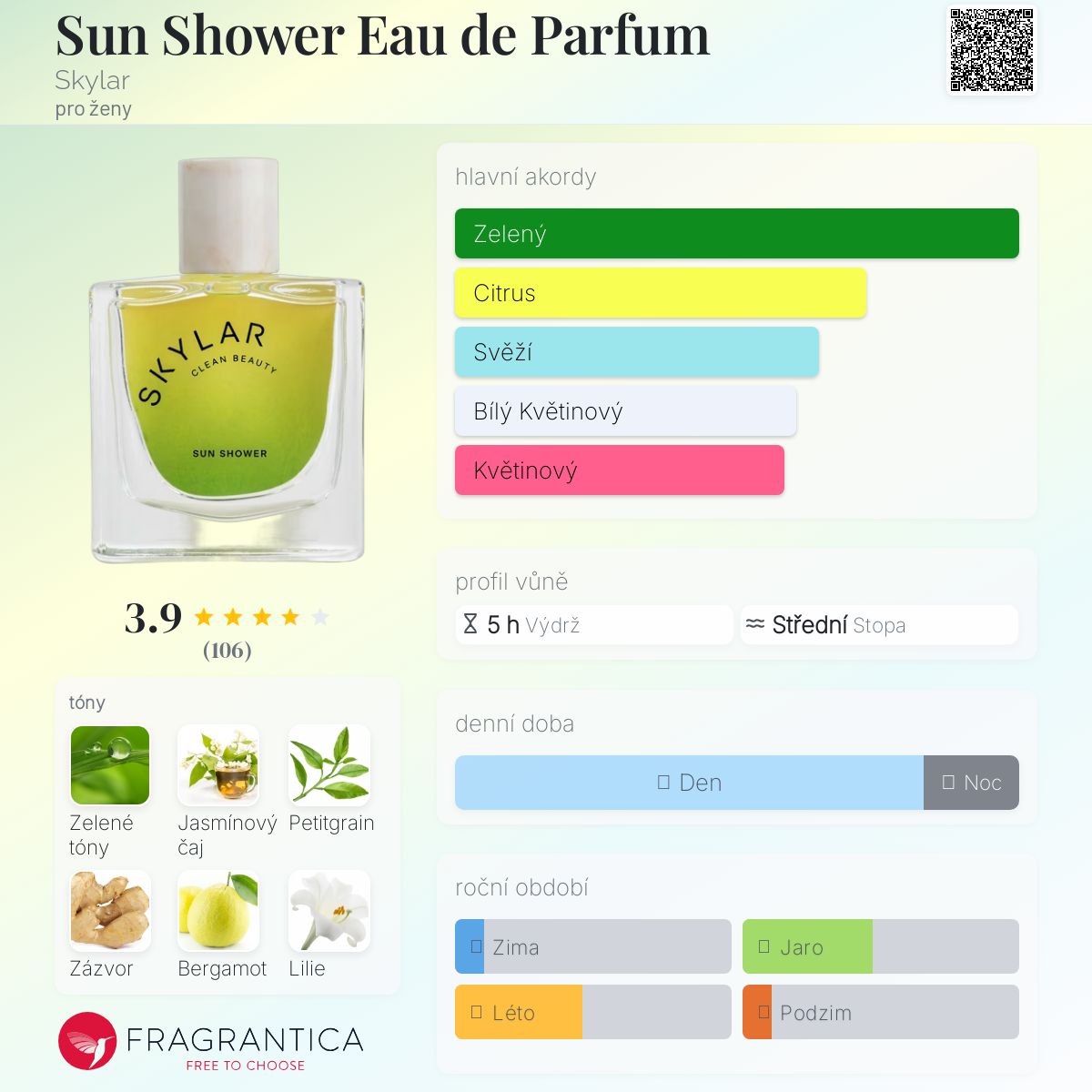 Sun Shower Eau de Parfum podle Skylar je Citrus Aromatic vůně pro ženy. Sun Shower Eau de Parfum byl/a uveden/a v roce 2021. "Nosem" za touto vůní je Gabriela Chelariu. Vrchní tóny jsou Jasmínový čaj, Petitgrain a Bergamot; střední tóny jsouZelené tóny, Květ zázvoru a Lilie ; základní tóny jsou Cedr, Cypřiš a Guajakové dřevo.