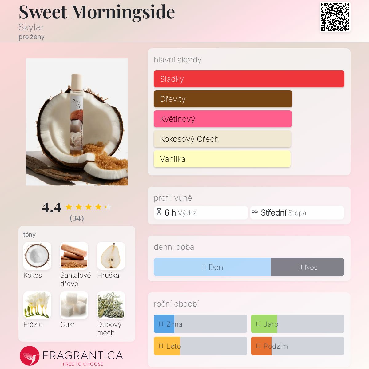 Sweet Morningside podle Skylar je Orientální Vanilla vůně pro ženy. Toto je nová vůně. Sweet Morningside byl/a uveden/a v roce 2024. Vrchní tóny jsou Hruška, Frézie a Fialkový list; střední tóny jsouKokos, Santalové dřevo a Vanilková orchidej ; základní tóny jsou Cukr, Mech, Fazole tonka a Pižmo.