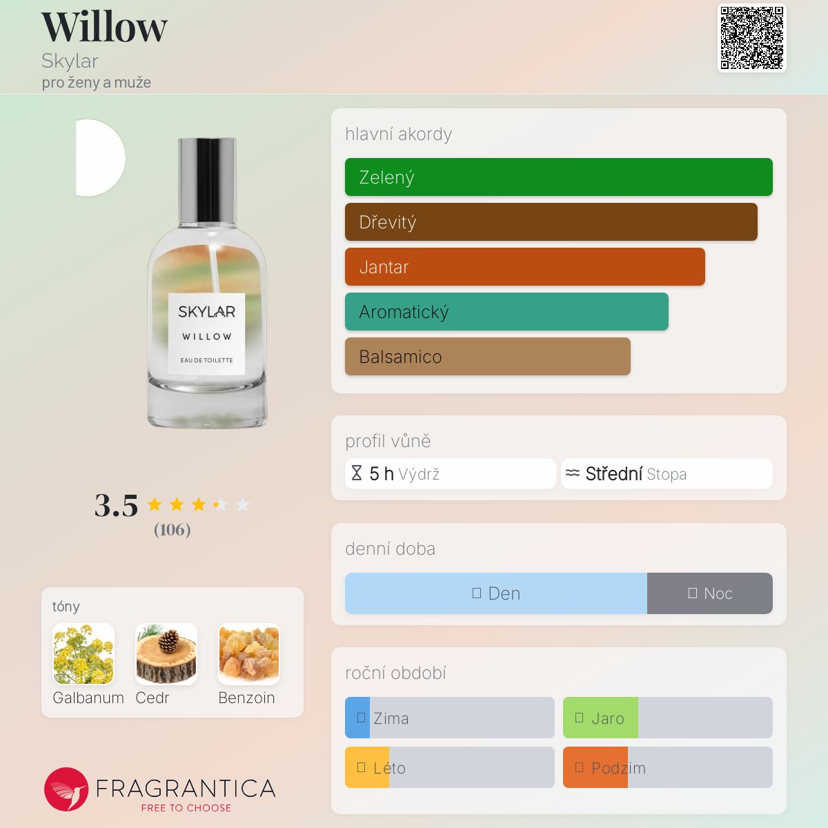 Willow podle Skylar je Woody Aromatic vůně pro ženy a muže. Willow byl/a uveden/a v roce 2018. "Nosem" za touto vůní je Sarah Horowitz.