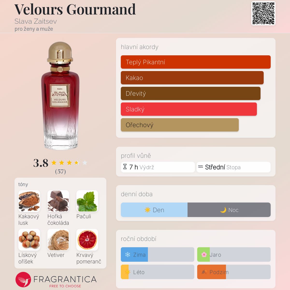 Velours Gourmand podle Slava Zaitsev je Orientální Vanilla vůně pro ženy a muže. Velours Gourmand byl/a uveden/a v roce 2021. "Nosem" za touto vůní je Robertet. Vrchní tóny jsou Lískový oříšek, Krvavý pomeranč a Mandle; střední tóny jsouKakao a Čokoláda ; základní tóny jsou Pačuli, Vetiver a Hnědý cukr.
