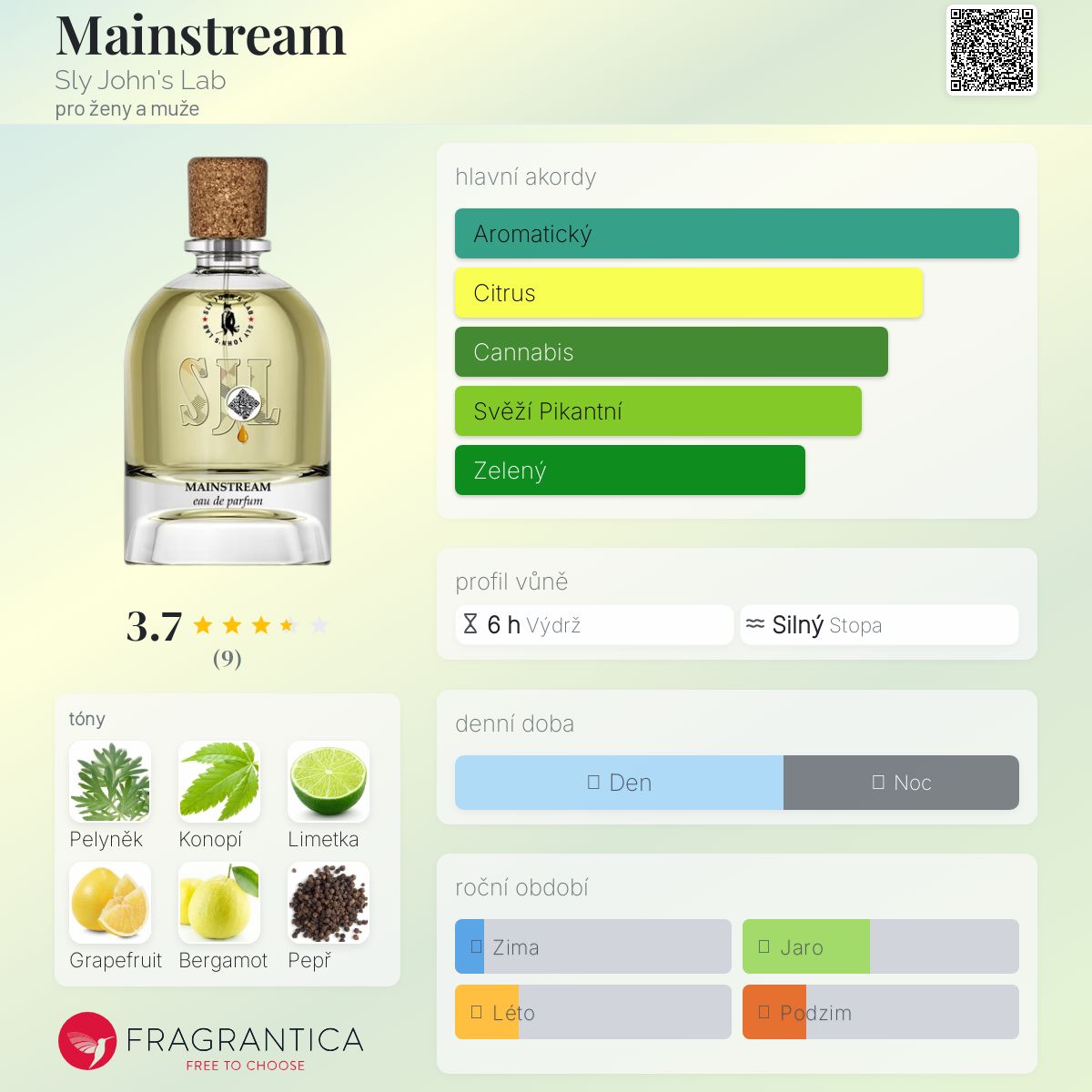 Mainstream podle Sly John's Lab je vůně pro ženy a muže. Mainstream byl/a uveden/a v roce 2023. "Nosem" za touto vůní je Chris Maurice. Vrchní tóny jsou Limetka, Grapefruit a Bergamot; střední tóny jsouPelyněk, Konopí, Černý pepř a Růžový pepř ; základní tóny jsou Pačuli, Vetiver a Guajakové dřevo.