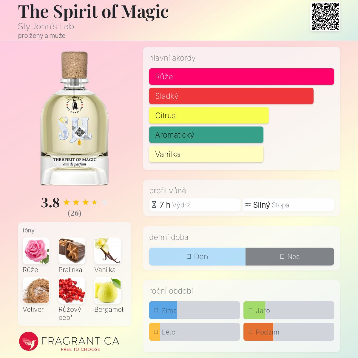 The Spirit of Magic podle Sly John's Lab je Aromatic vůně pro ženy a muže. The Spirit of Magic byl/a uveden/a v roce 2022. "Nosem" za touto vůní je Ane Ayo. Vrchní tóny jsou Růžový pepř, Bergamot a Citrón; střední tón jeRůže ; základní tóny jsou Pralinka, Vanilka a Haitský vetiver.