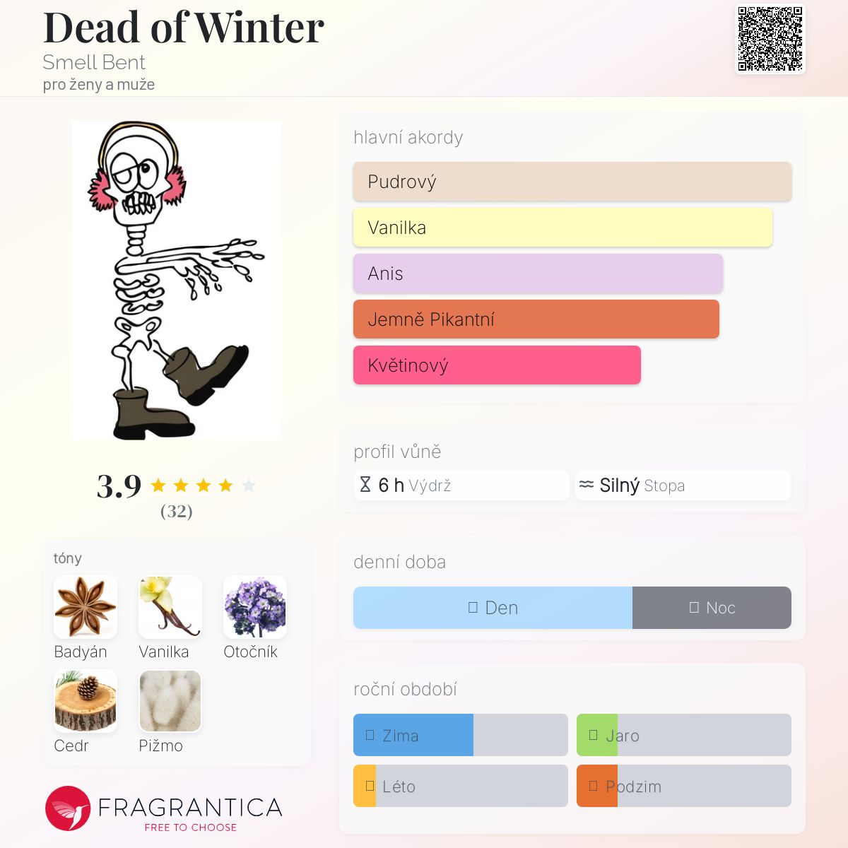Dead of Winter podle Smell Bent je Orientální vůně pro ženy a muže. Dead of Winter byl/a uveden/a v roce 2012. "Nosem" za touto vůní je Brent Leonesio.