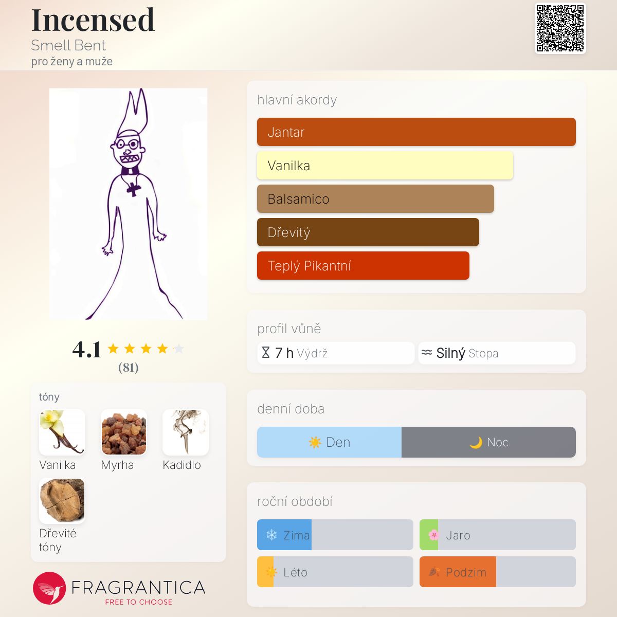 Incensed podle Smell Bent je Orientální Woody vůně pro ženy a muže. "Nosem" za touto vůní je Brent Leonesio. Vrchní tóny jsou Myrha a Kadidlo; základní tóny jsou Vanilka a Dřevité tóny.
