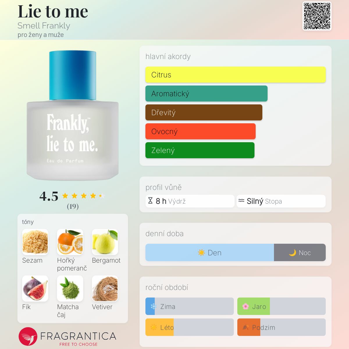 Lie to me podle Smell Frankly je Woody Aromatic vůně pro ženy a muže. Toto je nová vůně. Lie to me byl/a uveden/a v roce 2025. Vrchní tóny jsou Sezam, Hořký pomeranč a Bergamot; střední tóny jsouFík, Matcha čaj a Vetiver ; základní tóny jsou Cedr, Jantar (ambra) a Pižmo.