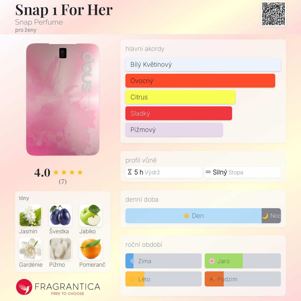 Snap 1 For Her podle Snap Perfume je Floral Fruity vůně pro ženy. Snap 1 For Her byl/a uveden/a v roce 2014. Vrchní tóny jsou Švestka, Jablko, Pomeranč, Italská mandarinka a Broskev; střední tóny jsouJasmín, Gardénie, Růže a Divoká orchidej ; základní tóny jsou Bílé pižmo a Cedr.