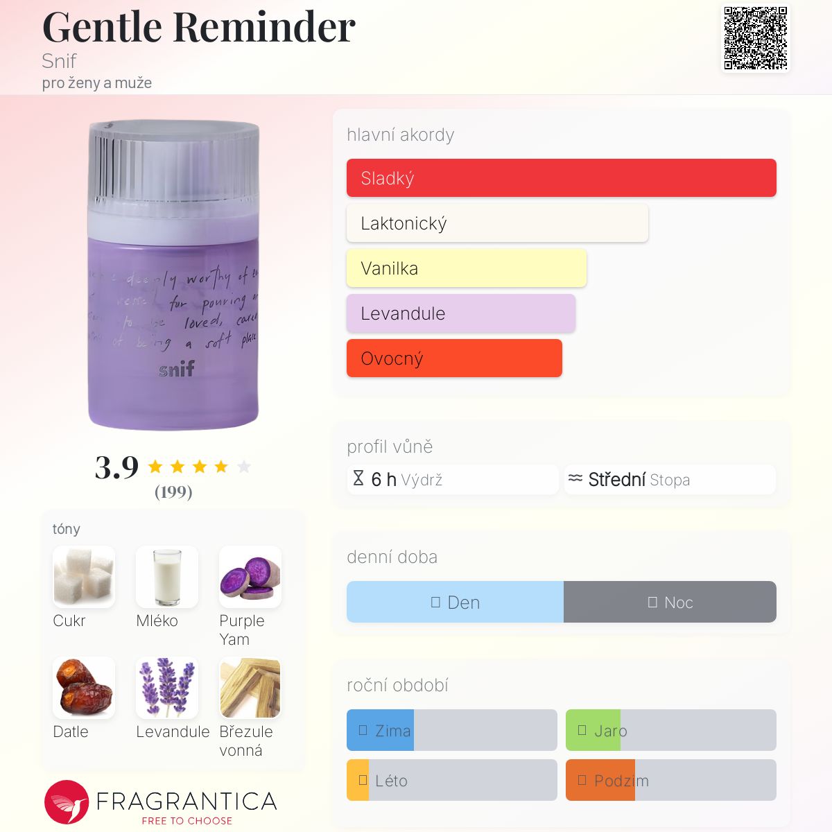Gentle Reminder podle Snif je Floral Fruity Gourmand vůně pro ženy a muže. Toto je nová vůně. Gentle Reminder byl/a uveden/a v roce 2025. "Nosem" za touto vůní je Patricia Choux. Vrchní tóny jsou Cukr, Mléko, Datle a Černý čaj; střední tóny jsouPurple Yam a Levandule ; základní tón je Březule vonná.