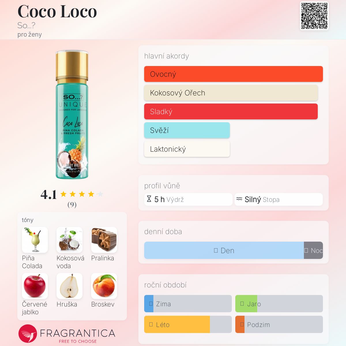 Coco Loco podle So...? je vůně pro ženy. Coco Loco byl/a uveden/a v roce 2023. Vrchní tóny jsou Červené jablko, Hruška a Broskev; střední tóny jsouPiña Colada, Kokosová voda a Mango ; základní tóny jsou Pralinka, Vanilka, Fazole tonka a Pižmo.