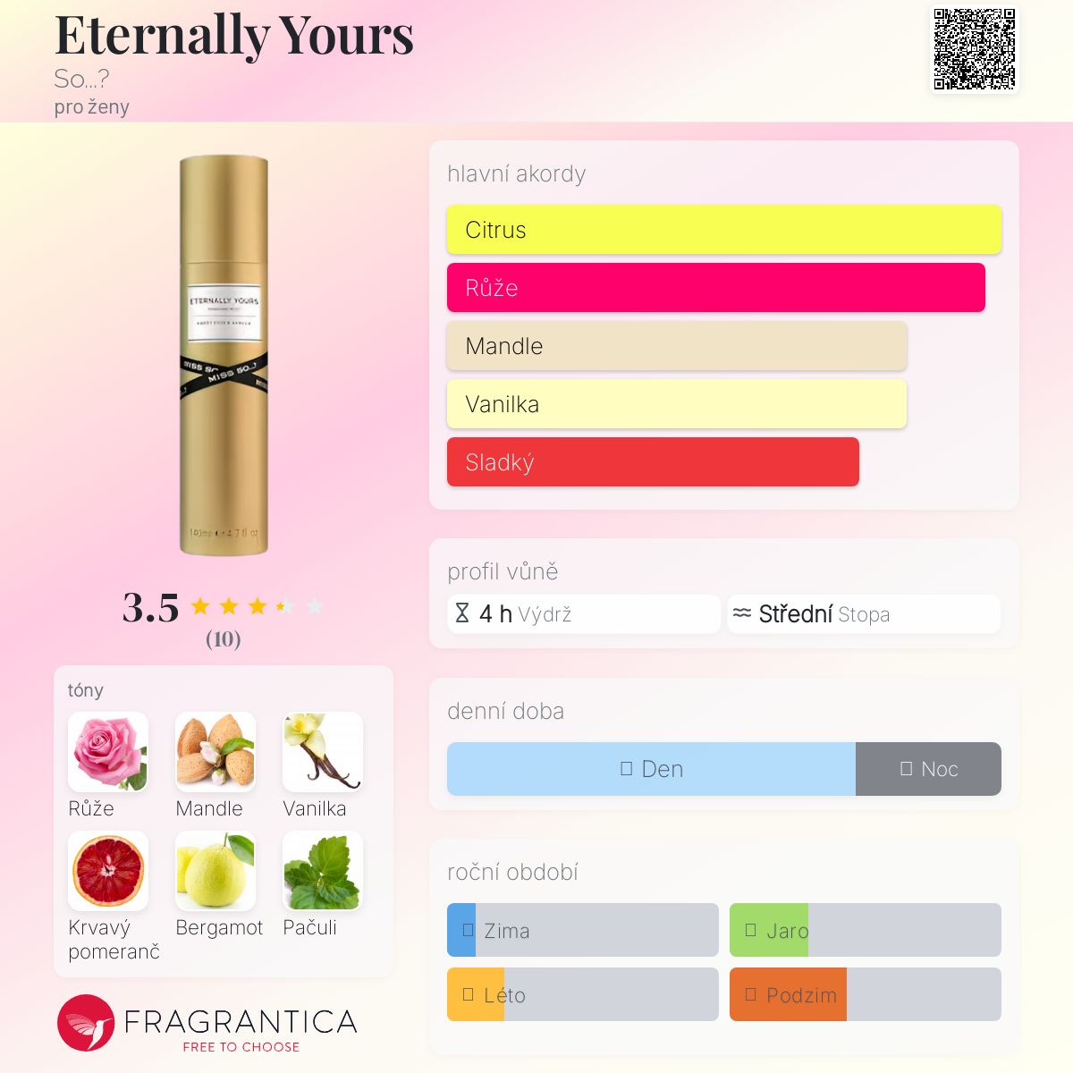 Eternally Yours podle So...? je Orientální Vanilla vůně pro ženy. Eternally Yours byl/a uveden/a v roce 2019. Vrchní tóny jsou Krvavý pomeranč a Bergamot; střední tóny jsouRůže a Mandle ; základní tóny jsou Vanilka, Pačuli a Pralinka.