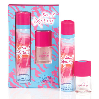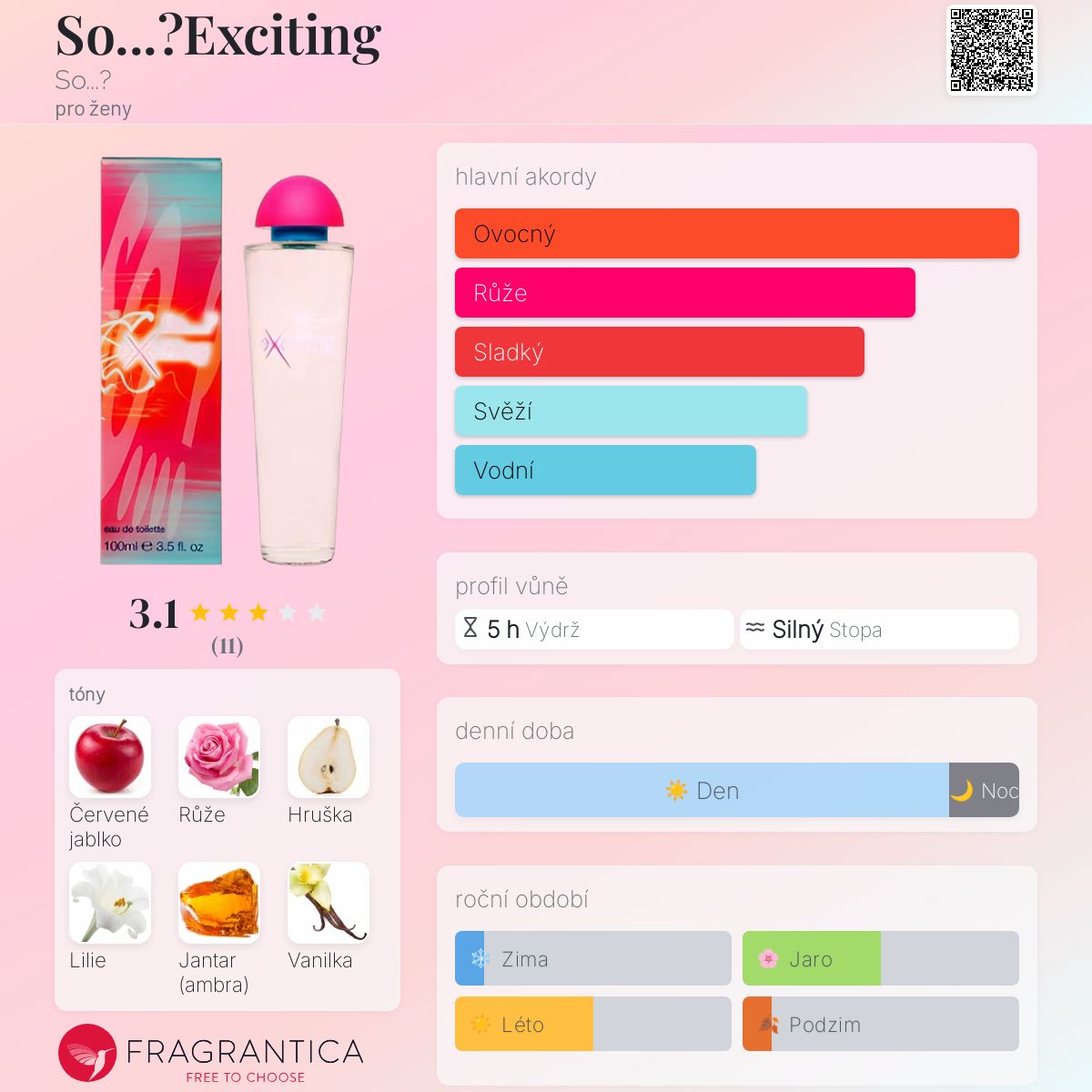 So...?Exciting podle So...? je Floral Fruity vůně pro ženy. Vrchní tón je Hruška ; střední tóny jsouČervené jablko, Tinktura z růže a Lilie ; základní tóny jsou Jantar (ambra) a Vanilka.