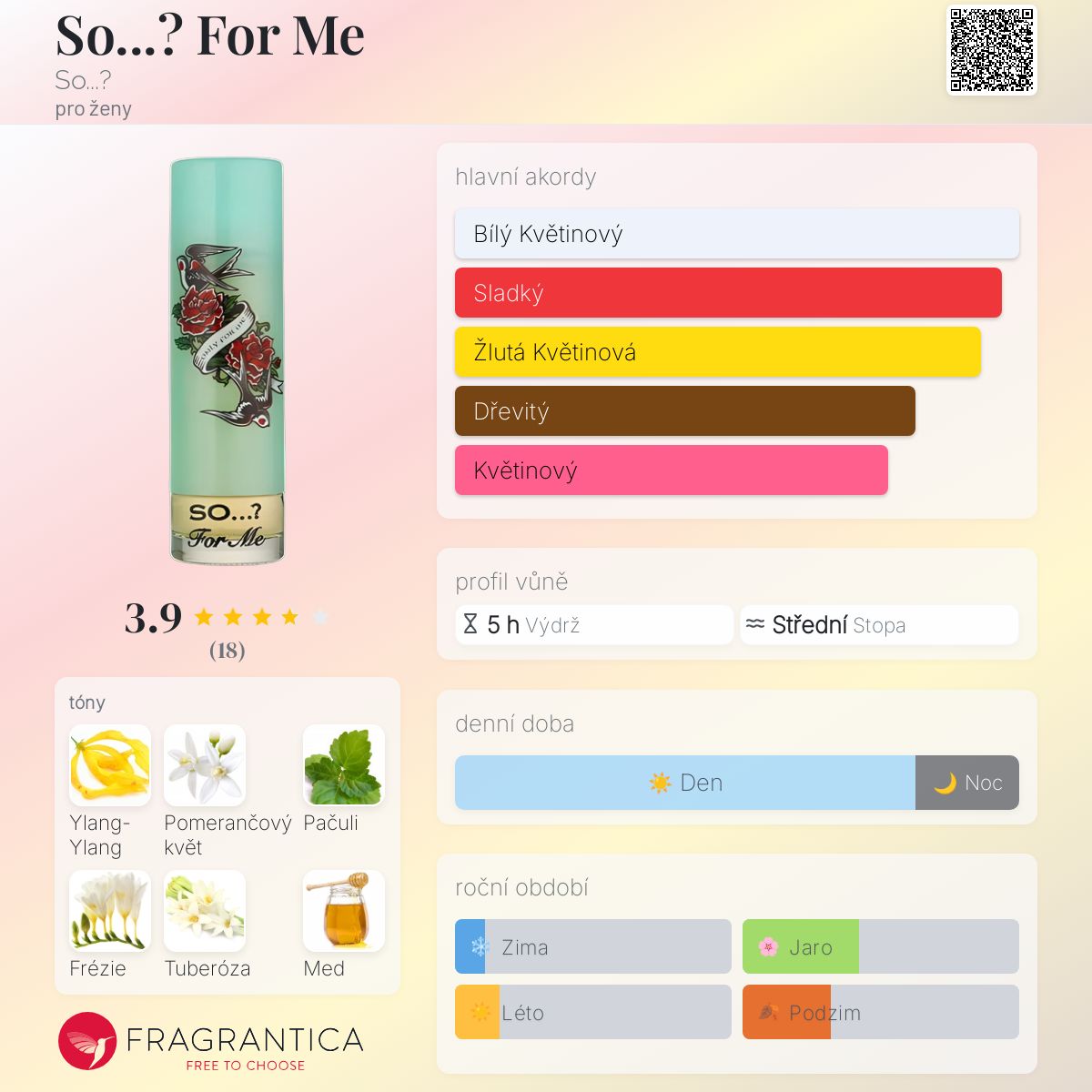 So...? For Me podle So...? je Floral Fruity Gourmand vůně pro ženy. Vrchní tóny jsou Pomerančový květ, Frézie a Velká jahoda; střední tóny jsouYlang-Ylang, Tuberóza a Med ; základní tóny jsou Pačuli a Mandle.