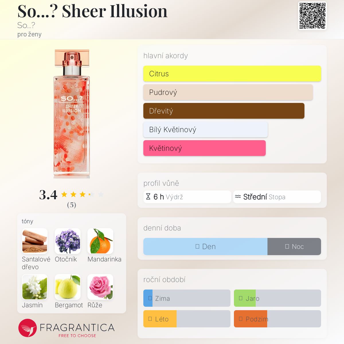 So...? Sheer Illusion podle So...? je Floral vůně pro ženy. So...? Sheer Illusion byl/a uveden/a v roce 2017. Vrchní tóny jsou Mandarinka a Bergamot; střední tóny jsouOtočník, Jasmín a Růže ; základní tón je Santalové dřevo.