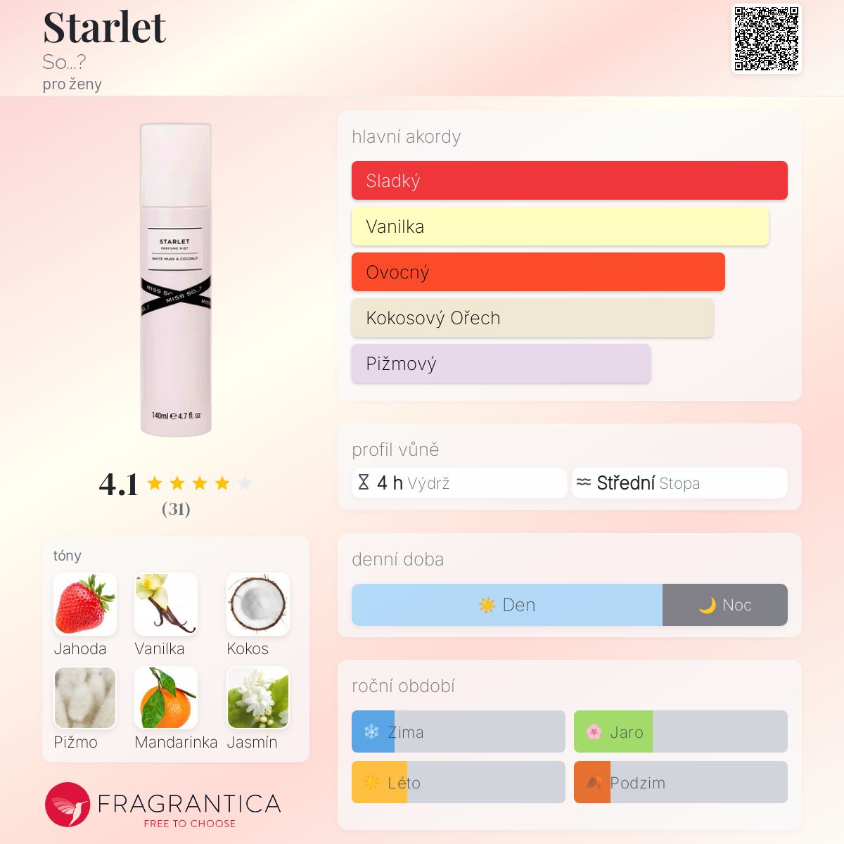 Starlet podle So...? je Floral Fruity Gourmand vůně pro ženy. Starlet byl/a uveden/a v roce 2019. Vrchní tóny jsou Jahoda a Mandarinka; střední tóny jsouVanilka a Kokos ; základní tóny jsou Bílé pižmo a Jasmín.