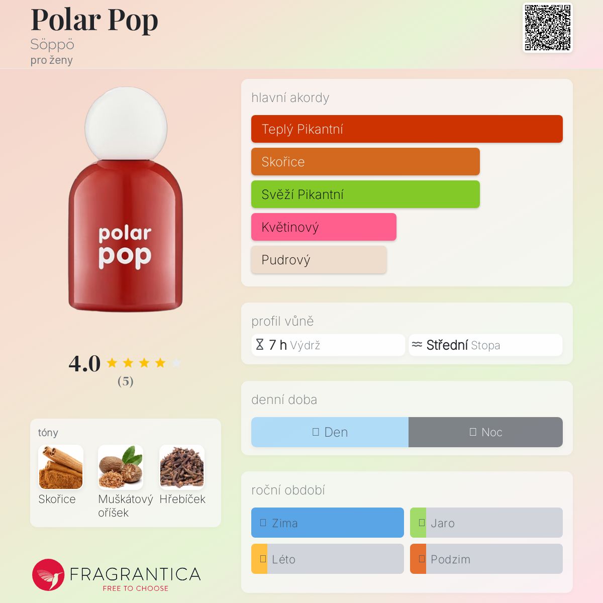 Polar Pop podle Söppö je Orientální Spicy vůně pro ženy. Polar Pop byla spuštěna během 2020. Vrchní tóny jsou Skořice, Muškátový oříšek a Hřebíček; střední tóny jsouSkořice, Muškátový oříšek a Hřebíček ; základní tóny jsou Skořice, Muškátový oříšek a Hřebíček.