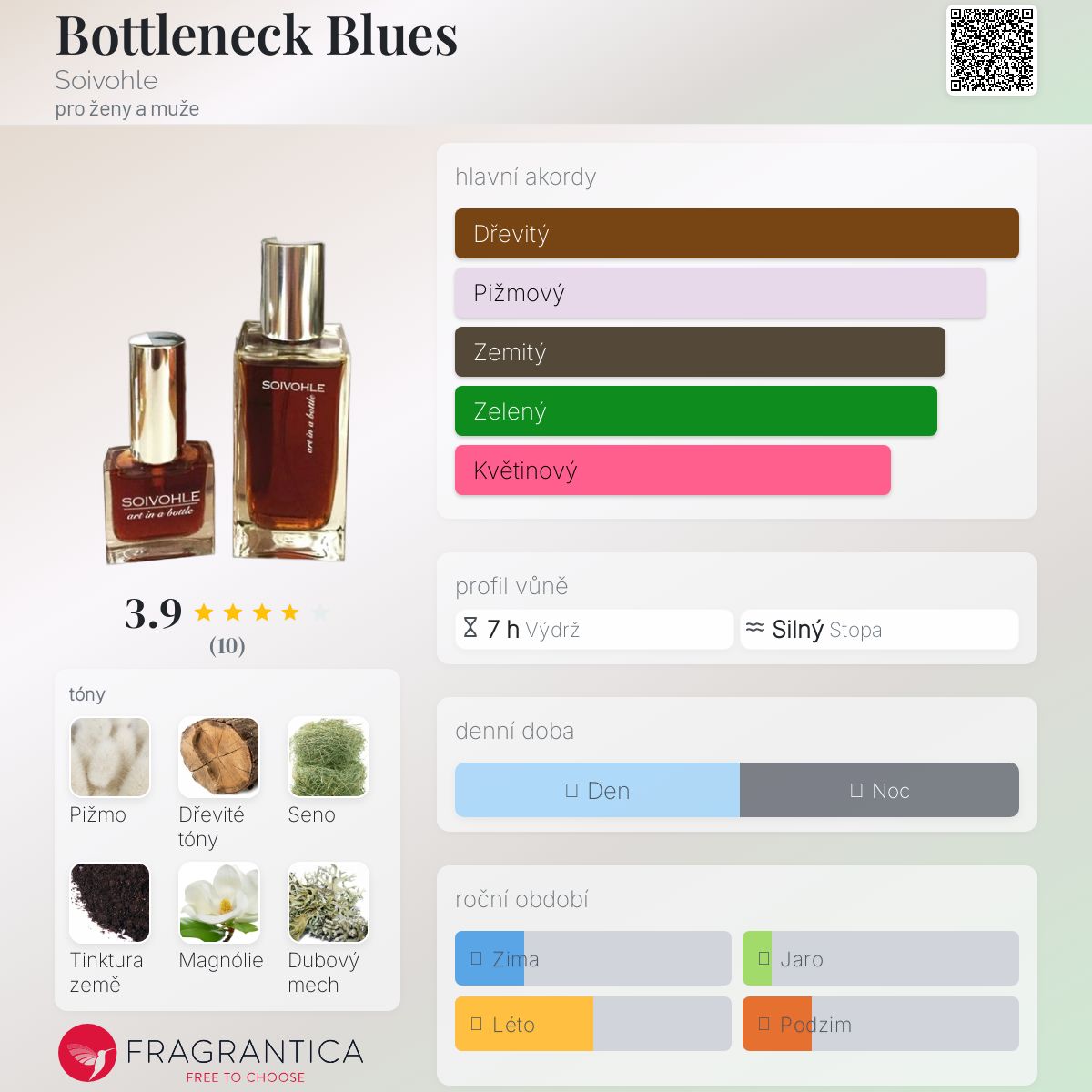 Bottleneck Blues podle Soivohle je Orientální Floral vůně pro ženy a muže. "Nosem" za touto vůní je Liz Zorn. Vrchní tóny jsou Pižmo, Seno, Půdní tinktura a Bergamot; střední tóny jsouMagnólie, Růže a Šeřík ; základní tóny jsou Dřevité tóny, Dubový mech, Vanilka a Labdanum.