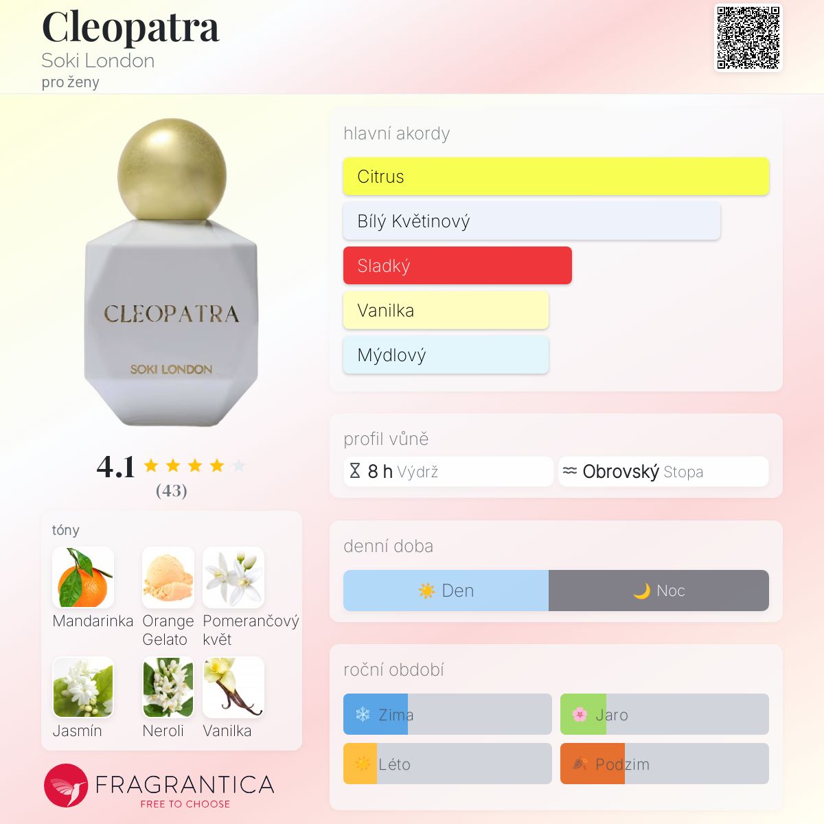 Cleopatra podle Soki London je vůně pro ženy. Toto je nová vůně. Cleopatra byl/a uveden/a v roce 2025. Cleopatra byl/a vytvořen/a Ruth Mastenbroek a Nic Mastenbroek. Vrchní tóny jsou Mandarinka a Pomerančové gelato; střední tóny jsouPomerančový květ, Jasmín Sambac a Neroli ; základní tóny jsou Vanilka, Santalové dřevo a Jantar (ambra).