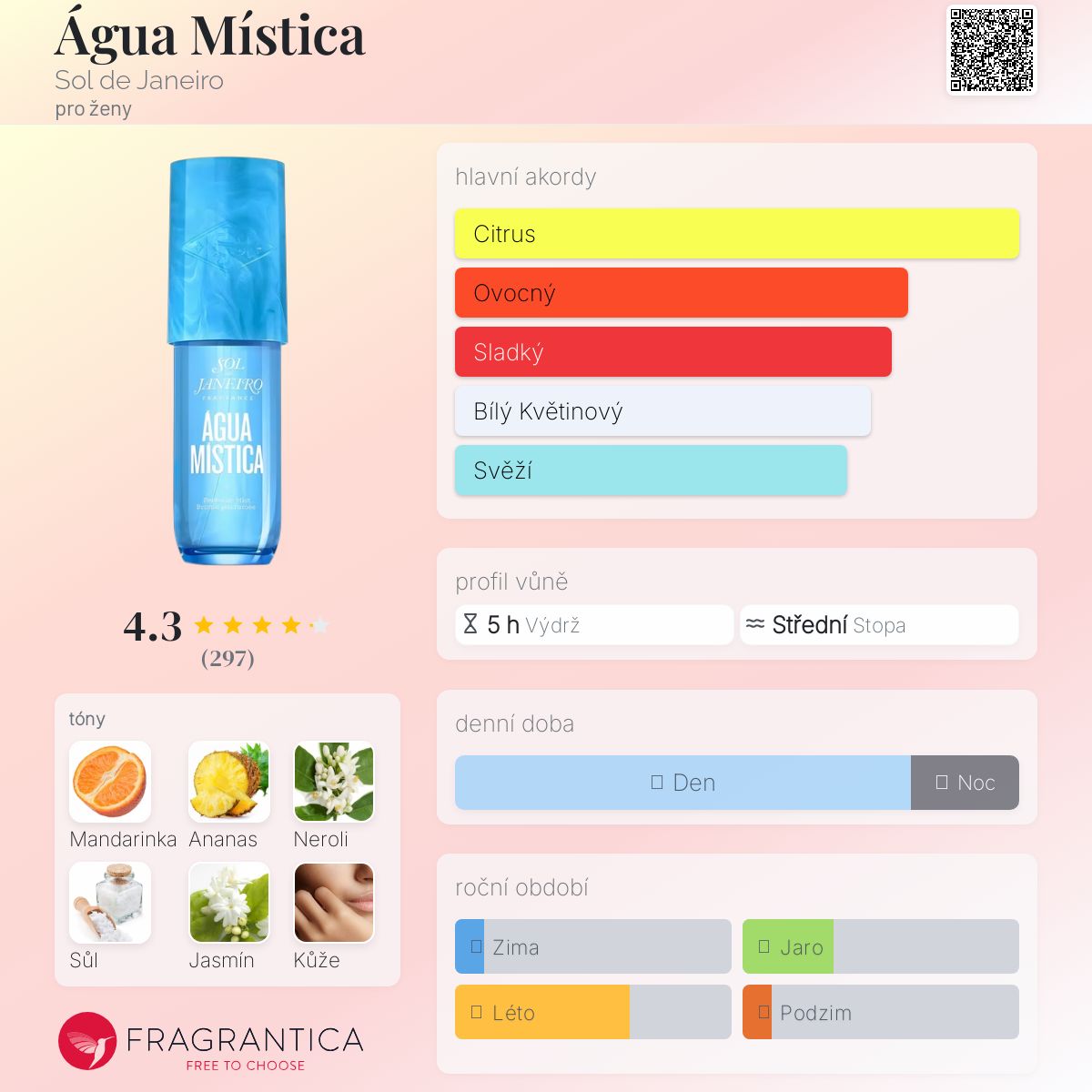 Água Mística podle Sol de Janeiro je Floral Aquatic vůně pro ženy. Toto je nová vůně. Água Mística byl/a uveden/a v roce 2025. Vrchní tóny jsou Mandarinka, Ananas a Neroli; střední tóny jsouJasmín a Pivoňka ; základní tóny jsou Sůl, Kůže a Extrakt z bílého cedru.