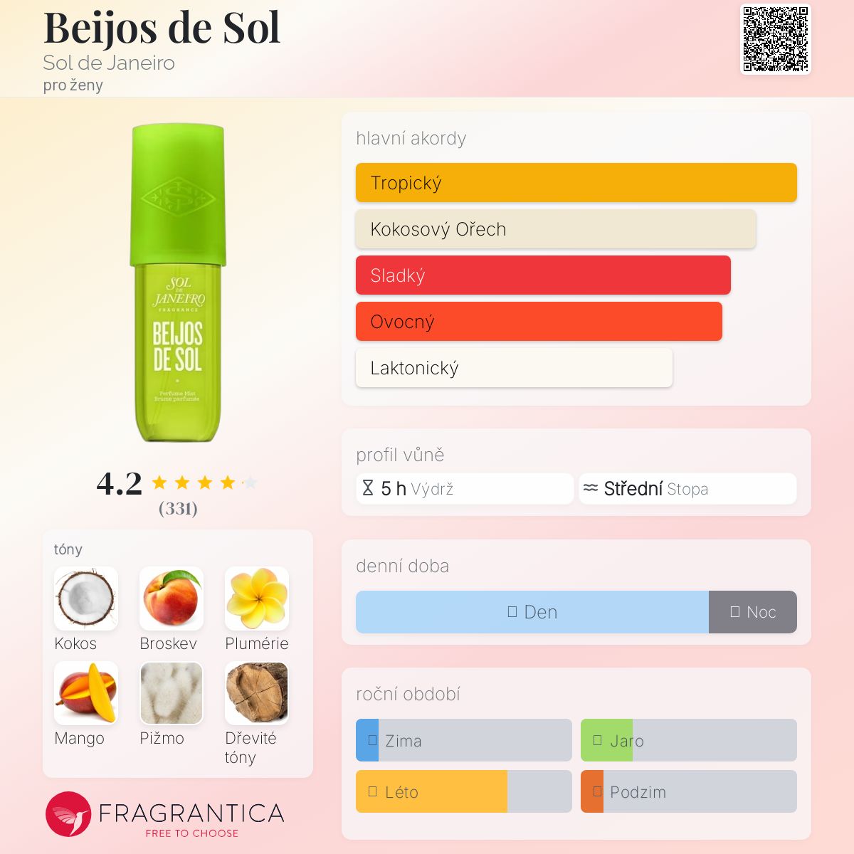 Beijos de Sol podle Sol de Janeiro je vůně pro ženy. Toto je nová vůně. Beijos de Sol byl/a uveden/a v roce 2024. "Nosem" za touto vůní je Clement Gavarry. Vrchní tóny jsou Broskev a Mango; střední tóny jsouKokosové mléko a Plumérie ; základní tóny jsou Bílé pižmo a Dřevité tóny.
