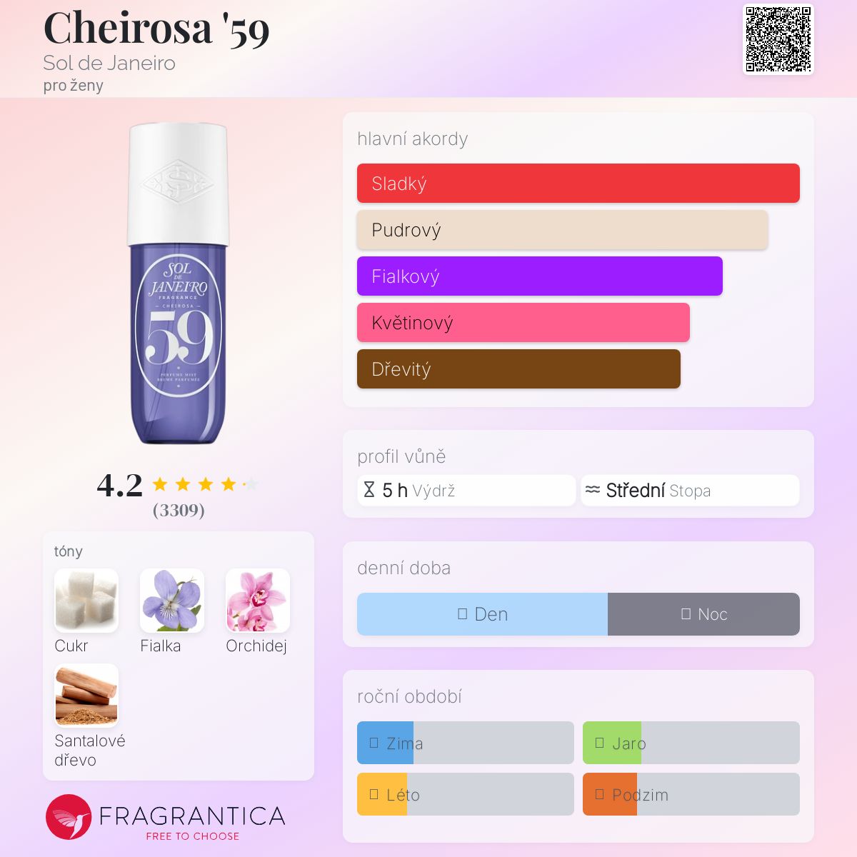 Cheirosa '59 podle Sol de Janeiro je Orientální Vanilla vůně pro ženy. Toto je nová vůně. Cheirosa '59 byl/a uveden/a v roce 2024. Vrchní tón je Vanilková orchidej ; střední tóny jsouCukr a Fialka ; základní tón je Santalové dřevo.