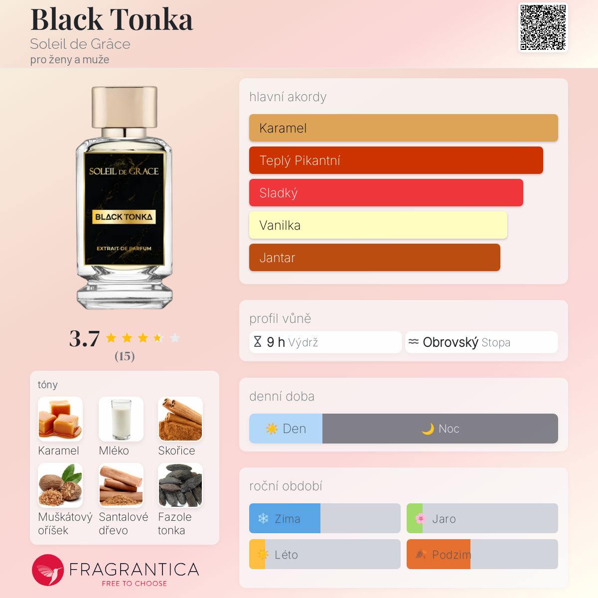 Black Tonka podle Soleil de Grâce je vůně pro ženy a muže. Toto je nová vůně. Black Tonka byl/a uveden/a v roce 2024. "Nosem" za touto vůní je Gökhan Şimşek. Vrchní tóny jsou Karamel, Mléko, Skořice, Muškátový oříšek, Tabák, Šafrán a Elemi; střední tóny jsouMimóza, Konvalinka a Jasmín ; základní tóny jsou Santalové dřevo, Fazole tonka, Vanilka, Benzoin, Jantar (ambra), Pačuli a Pižmo.