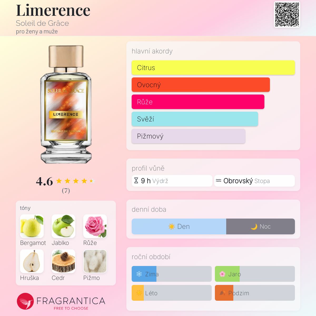 Limerence podle Soleil de Grâce je vůně pro ženy a muže. Toto je nová vůně. Limerence byl/a uveden/a v roce 2025. "Nosem" za touto vůní je Gökhan Şimşek. Vrchní tóny jsou Bergamot, Jablko, Hruška, Citrón, Kokos a Ananas; střední tóny jsouRůže, Červená chilli paprička, Kardamom a Elemi ; základní tóny jsou Cedr, Pižmo, Jantar (ambra), Santalové dřevo, Fazole tonka, Pačuli, Kůže a Vetiver.