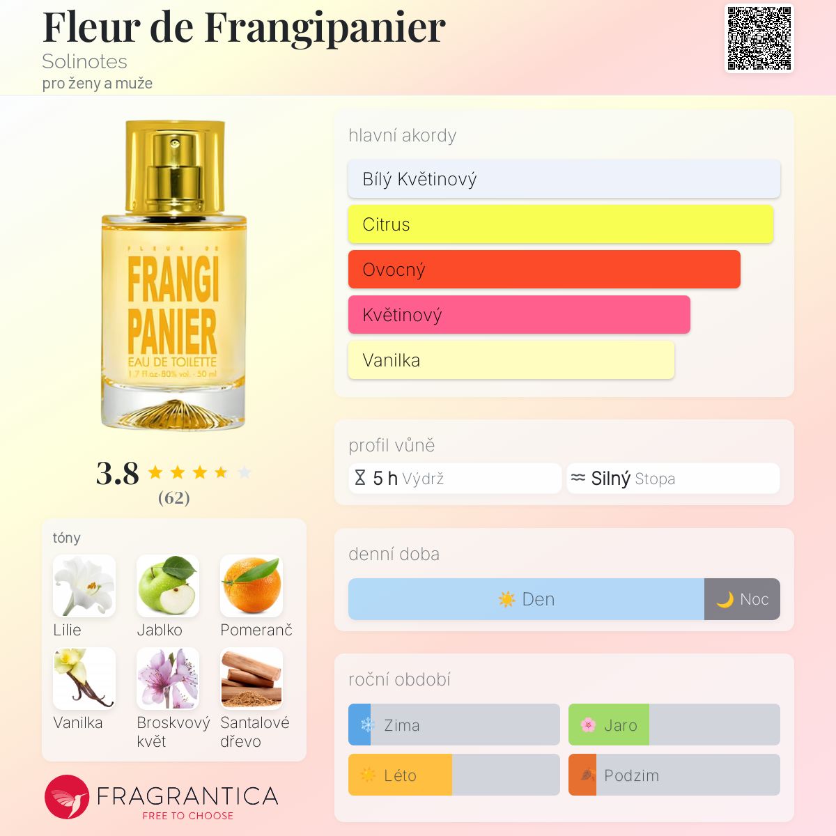 Fleur de Frangipanier podle Solinotes je Floral Fruity vůně pro ženy a muže. Fleur de Frangipanier byl/a uveden/a v roce 2014. Vrchní tóny jsou Jablko, Pomeranč a Bergamot; střední tóny jsouLilie, Broskvový květ a Růže ; základní tóny jsou Vanilka, Santalové dřevo a Pižmo.