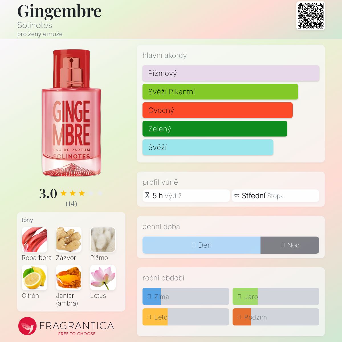 Gingembre podle Solinotes je Woody vůně pro ženy a muže. "Nosem" za touto vůní je Vincent Ricord. Vrchní tóny jsou Rebarbora, Zázvor a Citrón; střední tóny jsouKřišťálový jantar a Lotus ; základní tóny jsou Pižmo, Santalové dřevo a Cedr.