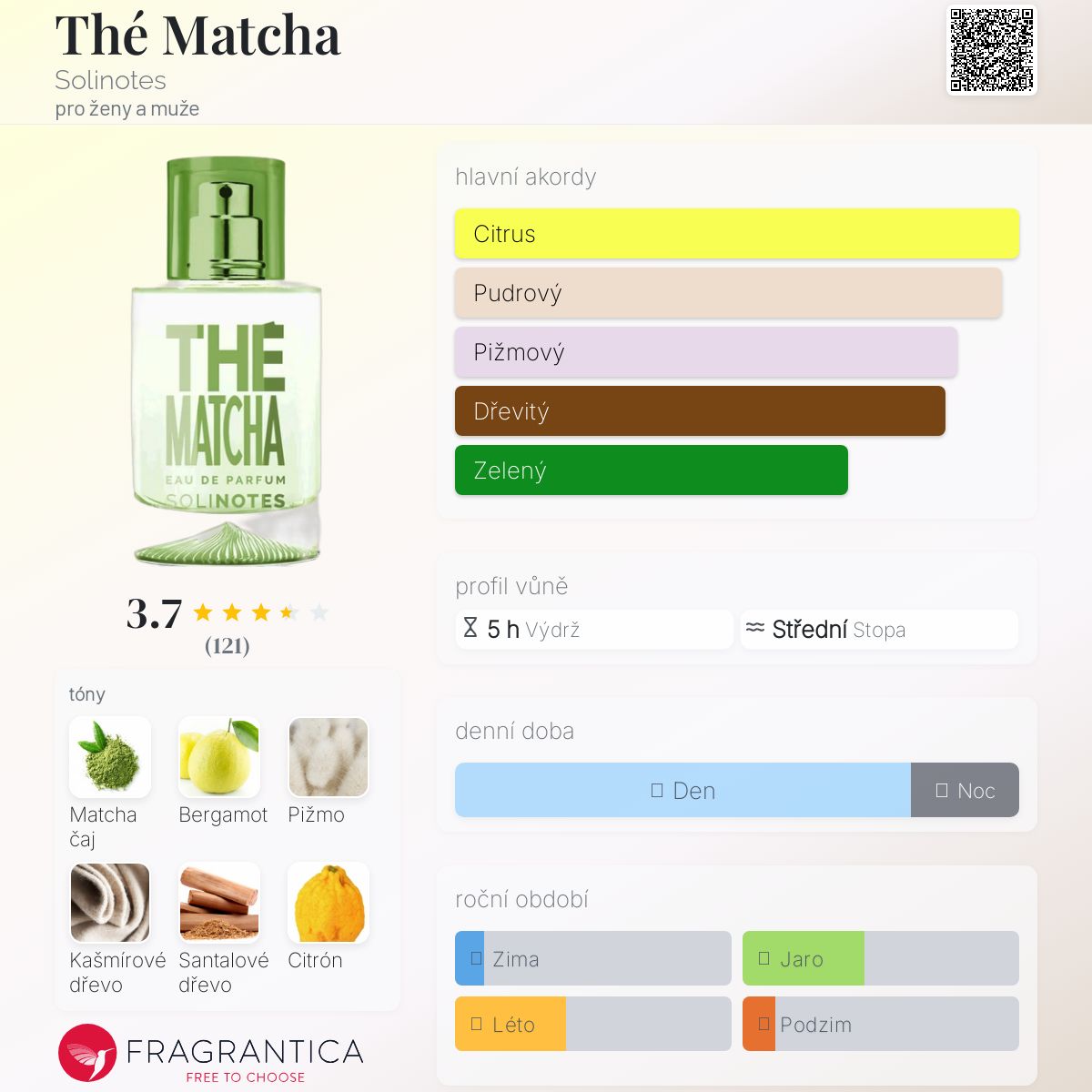 Thé Matcha podle Solinotes je vůně pro ženy a muže. Thé Matcha byl/a uveden/a v roce 2023. "Nosem" za touto vůní je Pierre Flores. Vrchní tóny jsou Bergamot, Citrón a Kardamom; střední tóny jsouMatcha čaj, Kašmírové dřevo a Růže ; základní tóny jsou Pižmo, Santalové dřevo a Bílý jantar (ambra).