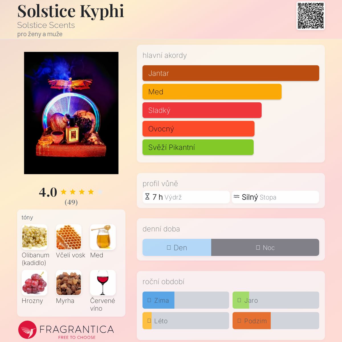 Solstice Kyphi podle Solstice Scents je vůně pro ženy a muže. Solstice Kyphi byl/a uveden/a v roce 2018. "Nosem" za touto vůní je Angela St.John.